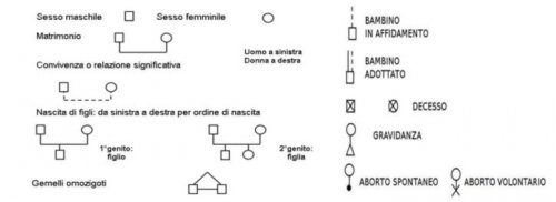 È bene disegnare simboli standard per rendere grafiche le relazioni intime, quelle più distanti, tese, conflittuali, etc. È altrettanto indispensabile usufruire di simboli che permettano di rendere grafici i casi di abuso fisico, emotivo o sessuale. In molti casi bisognerà aggiungere qualche elemento per denotare che si sospetta di questi, ma che non si tratta di evidenze.