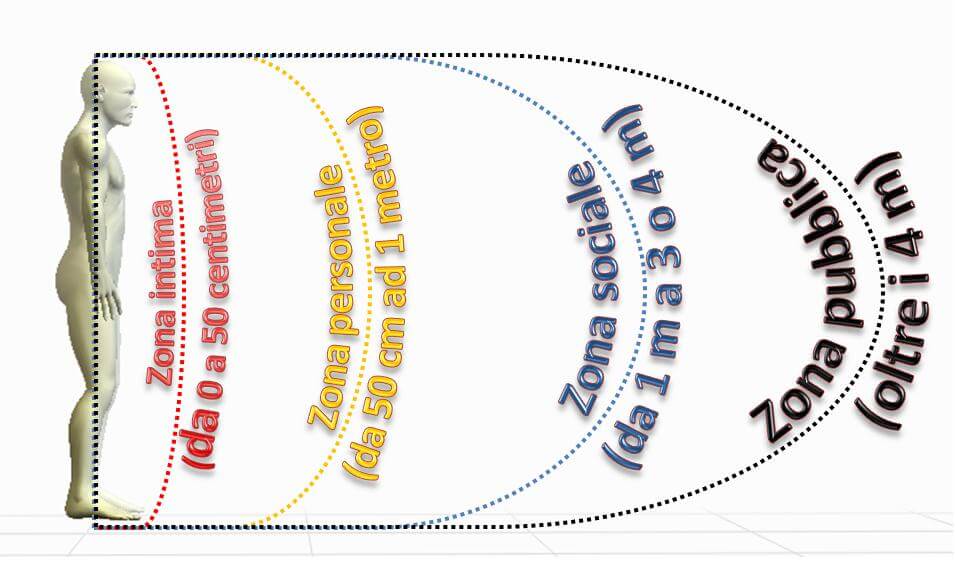 La prossemica – parte della semiotica dedicata allo studio dell’organizzazione dello spazio nella comunicazione linguistica – rivela come le persone tendano a muoversi su quattro diversi tipi di spazio in base al livello di confidenza provata nei confronti della persona con cui stanno comunicando. Ecco di seguito enumerate le quattro zone: